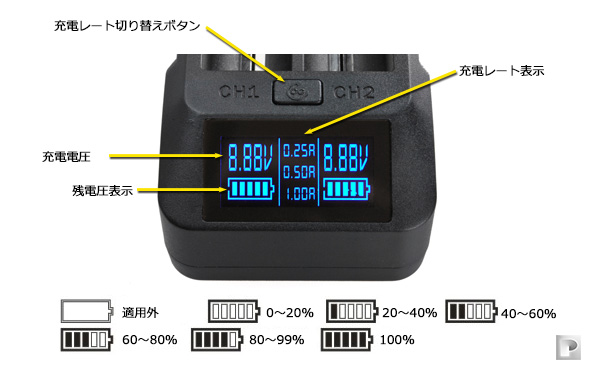 - 充電電圧:250mA、500mA、1A